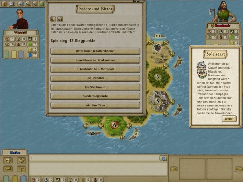 Die legendäre Insel Catan multimedial entdecken, erschließen und erobern – die neue PC-Umsetzung des beliebten Brettspiels macht’s möglich. Für „Catan – Städte und Ritter“ wurde originalgetreu das Regelwerk des Spieleklassikers und seiner Erweiterungen „Seefahrer“ und „Städte und Ritter“ übernommen. Die Konzeption und Entwicklung erfolgte unter der Federführung von Klaus Teuber, dem Urvater von Catan. Klaus Teubers Brettspiel „Catan“ hat bereits im Jahr seiner Erscheinung 1995 einen wahren Siegeszug angetreten und wurde gleich mehrfach ausgezeichnet. Im Laufe der Jahre haben sich die Catan-Spiele zu echten Klassikern entwickelt und Millionen von Menschen weltweit stundenlangen Spielspaß gebracht.Jetzt heißt es, Catan auf dem PC zu entdecken. Das große Ziel ist es, wie auch beim Vorbild, die Vorherrschaft über Catan zu erringen. Zu diesem Zweck werden Siedlungen gegründet, Straßen gebaut und die Ressourcen Erz, Lehm, Holz und Wolle getauscht. Die Krone Catans winkt dem, der sich der richtigen Strategie bedient und ein kleines bisschen Glück mitbringt.„Catan – Städte und Ritter“ bietet packendes Spielvergnügen für jeden – vom Fan der ersten Stunde bis zum Neueinsteiger. Zur Auswahl stehen insgesamt acht verschiedene Computergegner, die in ihrer jeweiligen Spielstärke variieren und in ihren Strategien nicht verschiedener sein könnten. So fährt Siegfried mit seiner Rittermacht eine offensiv-kriegerische Taktik, während Louis eher auf Expansionspolitik setzt. William hat als stärkster Gegner alle Handelstricks drauf und kalkuliert stets vorausschauend. Die umfangreiche Kampagne umfasst zahlreiche abwechslungsreiche Szenarien, wie etwa „Die erste Insel“, „Der Hafenmeister“ oder „Dürre“. Dazu können Einzelszenarien der Kampagne freigeschaltet und mit verschiedenen Optionen wie „Freundlicher Räuber“ oder „Kartenstapel“ gespielt werden. Animierte und gesprochene Storysequenzen führen die Geschichte der Kampagne zwischen den Einzelszenarien weiter. Den Einstieg erleichtert ein interaktives Tutorial. Geübten Spielern stehen umfangreiche Statistiken zur Verfügung.Features: Originalgetreue Umsetzung des Brettspielklassikers und seiner Erweiterungen „Seefahrer“ und „Städte und Ritter“ Entwickelt mit Klaus Teuber, dem Urvater von Catan Acht Computergegner mit unterschiedlichen......