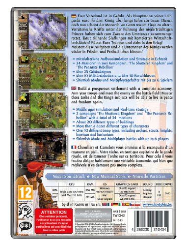 THE SHATTERED KINGDOM: Euer Vaterland ist in Gefahr! Als Hauptmann seiner Leibgarde wart Ihr dem König über lange Jahre ein treuer Diener, doch nun scheint der Monarch vor Gram wie im Fluge zu altern. Verräterische Kräfte unter der Führung des niederträchtigen Prinzen haben sich zum Zwecke des Umsturzes zusammengerottet. Der Bruderkrieg verwüstet die einst so fruchtbaren Provinzen des Reiches. Übernehmt den Oberbefehl über die königstreuen Truppen! Befreit Provinz um Provinz vom Joch der Unterdrückung! THE PEASANTS REBELLION: Baut blühende Siedlungen mit kompletten Wirtschaftkreisläufen! Rüstet Eure Truppen und zieht in den Krieg! Meistert diese Aufgaben und die Untertanen des Königs werden wieder in Frieden und Freiheit leben können! + Mix aus mittelalterlicher Aufbausimulation und Strategie in Echtzeit + 2 Kampagnen "The Shattered Kingdom" und "The Peasants Rebellion" mit insgesamt 34 Missionen + Skirmish Modus und 10 Multiplayer-Maps + Über 25 Gebäudetypen + mehr als 10 Militäreinheiten und über 10 Berufsklassen + detaillierte Animation der Produktionsvorgänge und Einheitenbewegung sowie gerenderte Zwischensequenzen + Multiplayergefechte mit bis zu 6 Spielern im LAN oder im Internet + Brandneuer Soundtrack, Win7 kompatibel...