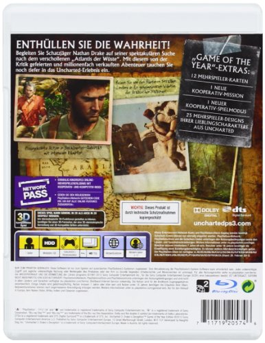 Die Game of the Year Edition enthält folgende Erweiterungen aus den Download-Inhalten: * Klassisches Charakter-Design-Paket 1-3: 25 verschiedene Charakter-Designs für den Multiplayer-Modus von Uncharted 3 - darunter Fan-Favoriten wie Nathan Drake aus dem originalen Drakes Schicksal oder Drake im Winter, der in Uncharted 2: Among Thieves in Tibet zu sehen war. * Rückblende-Kartenpakete 1 und 2: Enthält acht Karten mit überarbeiteten, verbesserten Versionen von Umgebungen aus Uncharted: Drakes Schicksal und Uncharted 2: Among Thieves für den Multiplayer-Modus von UC3. * Drake's Deception"-Kartenpaket: Vier neue Multiplayer-Karten: "Friedhof", "Altstadt", "Straßen von London" und "Oase" - jede mit eigenen, dynamischen Events. * Kooperativ-Abenteuer "Fort": "Fort", ein zusätzlicher Inhalt für den Online-Spielmodus "Kooperativ-Abenteuer", führt die Spieler auf der Suche nach Nathan Drake auf eine Reise durch eine Festung, die zum ersten Mal in Uncharted: Drakes Schicksal zu sehen war. * Kooperativ-Schatten-Überleben: Nimm es mit Welle um Welle der schwierigsten Gegner der Reihe auf - den feurigen Dschinns. Dieser kooperative Spielmodus bietet solide Multiplayer-Herausforderungen mit tollen Belohnungen. * Donut-Design-Paket: Wenn ihr euch je gefragt habt, wie Sully ausgesehen hätte, wenn er sich wirklich hätte gehen lassen, dann ist das genau das richtige Design-Paket für euch. Fünf Charaktere aus der Reihe, überlebensgroß dargestellt ......